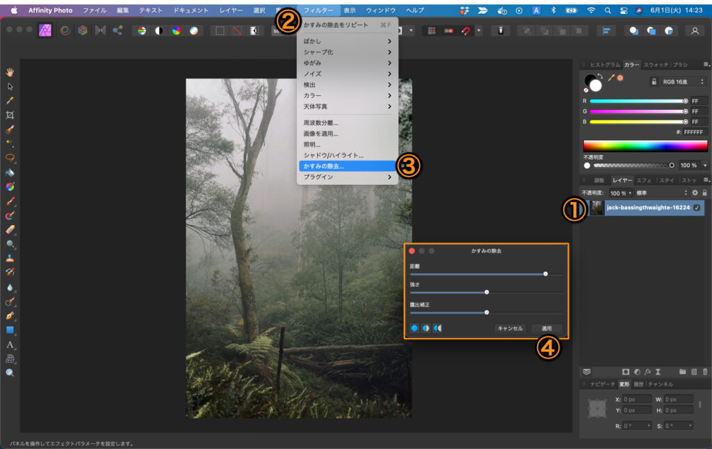 ②レイヤー>③かすみの除去を選択。